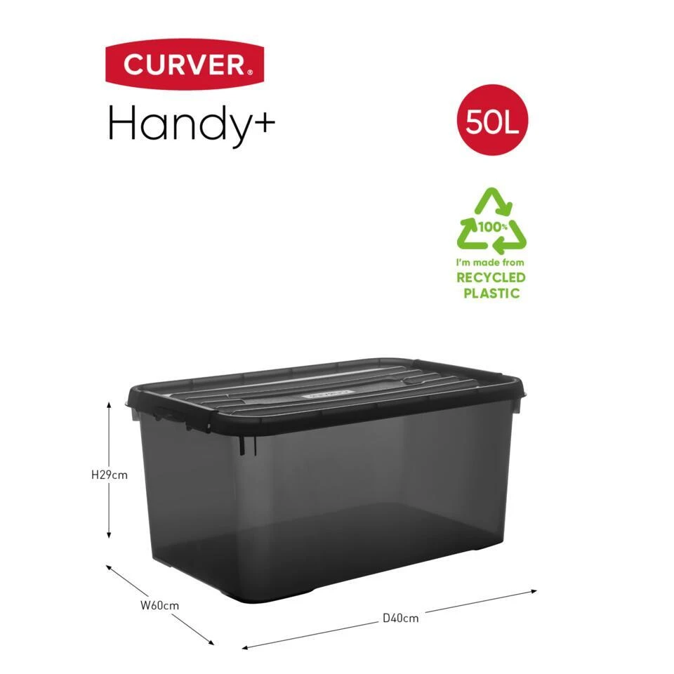 Deze Curver Handy+ Set bevat 2 ruime opbergboxen van 50 liter, perfect voor het organiseren van allerlei spullen in huis. Dankzij het transparante ontwerp zie je in één oogopslag wat erin zit. De handige clips zorgen voor een stevige en veilige sluiting, zodat alles netjes op zijn plek blijft. De afgeronde hoeken maken schoonmaken eenvoudig, terwijl het slimme design ervoor zorgt dat de boxen met deksel stapelbaar zijn.