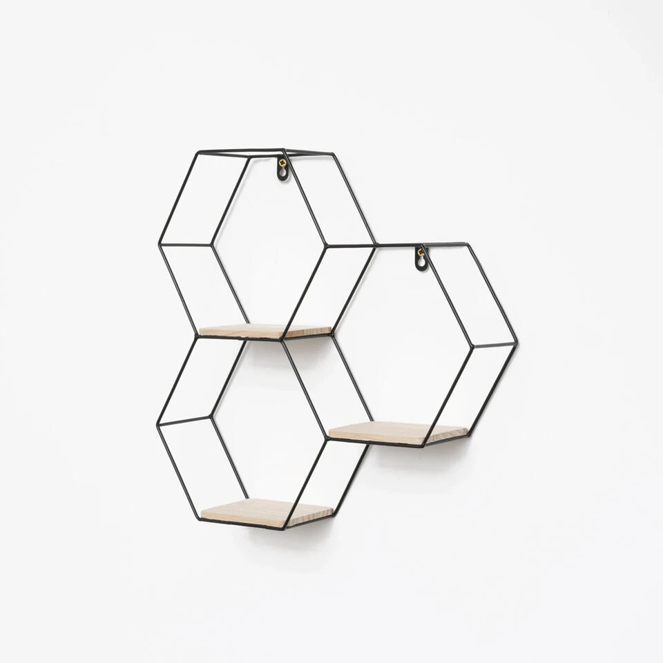 Op zoek naar een metalen wandrek om je interieur meer sfeer te geven? Wandrekken zijn dé trend van dit moment. Je kunt ze decoreren met jouw favoriete woonaccessoires. Dit hexagon wandrek heeft een zwart frame en bestaat uit drie zeshoeken voorzien van houten plankjes. De honingraat vorm maakt het rekje speels en eigentijds.