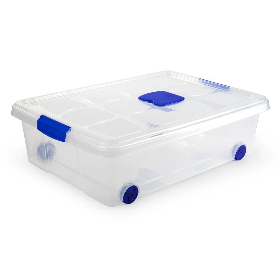 Opslagbakken / Opslagboxen organizers op wielen met deksel met een inhoud van 31 liter. Transparante opbergbakken met deksel welke is voorzien van sluitclips. Handig voor het opbergen van spullen. Inhoud: ca. 31 liter. Formaat: 62 x 45 x 18 cm. Materiaal: kunststof (plastic).