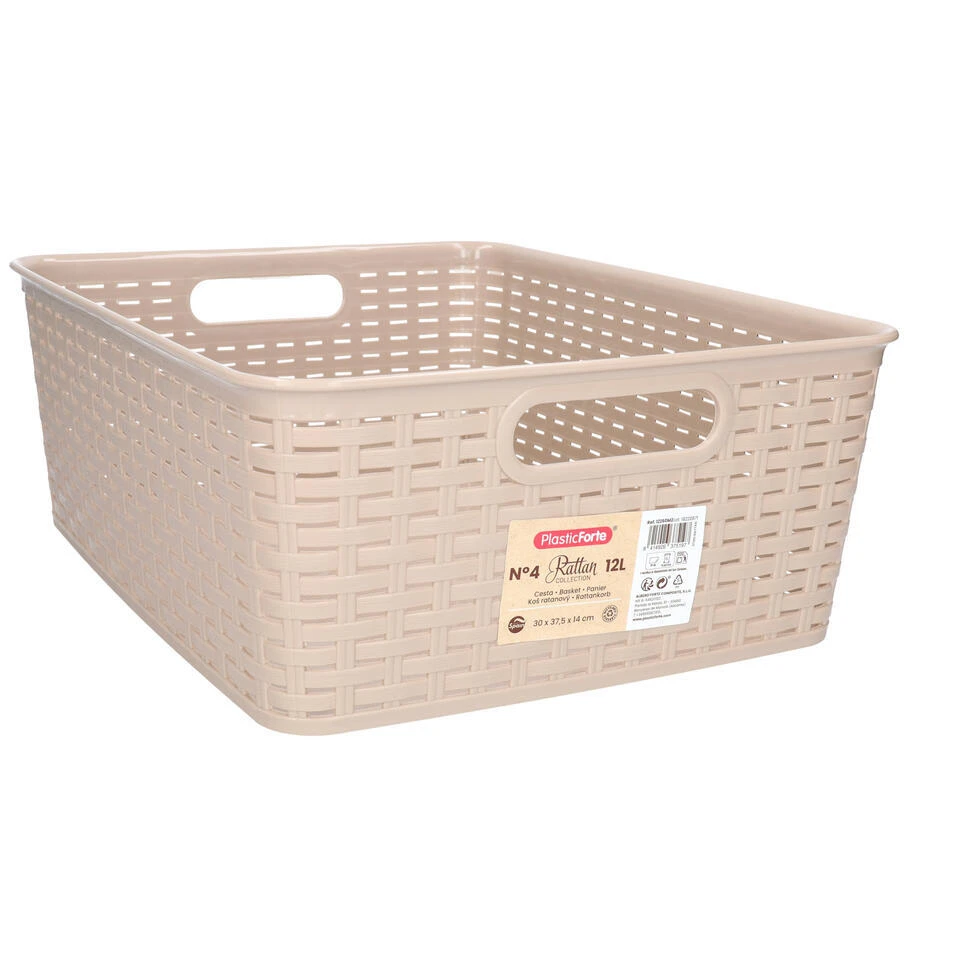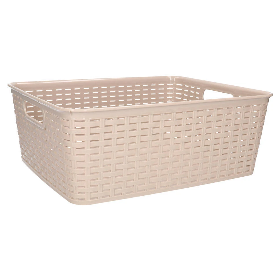 Opbergmand/kastmand gemaakt van rotan gevlochten kunststof in de kleur beige. Deze manden zijn kast-organisers of zijn prima in de woonkamer, badkamer, keuken of slaapkamer plaatsen. De mandjes zijn bijvoorbeeld geschikt voor het opbergen van speelgoed, kleding stukken, kantoor spullen, etenswaren en het opbergen van diverse spullen. Formaat: ongeveer 30 x 37 x 13 cm. Inhoud: 12 liter.