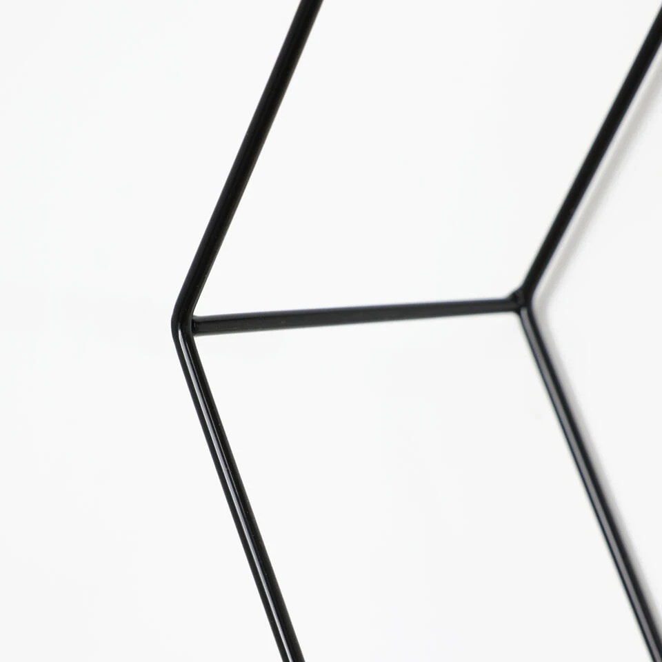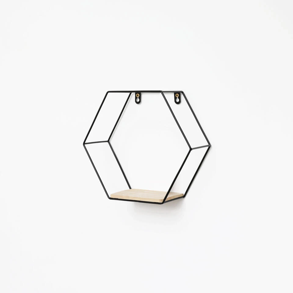 Op zoek naar een manier om je interieur meer sfeer te geven? Wandrekken zijn dé trend van dit moment. Je kunt ze decoreren met jouw favoriete woonaccessoires. Deze zeshoekige wandrekjes hebben een zwart frame en één houten plankje. De set bestaat uit 3 wandrekjes.